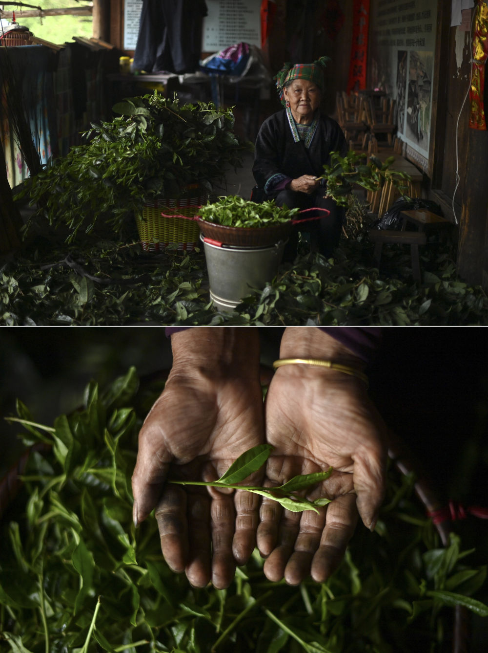 上圖:在廣西柳州市融水苗族自治縣香粉鄉(xiāng)中坪村,苗族姑娘賈宥凌(右三)在收茶葉;下圖:賈宥凌在泡茶(4月20日攝)。2019年,賈宥凌返鄉(xiāng)創(chuàng)業(yè),借助直播和短視頻銷售大苗山的農(nóng)副產(chǎn)品。