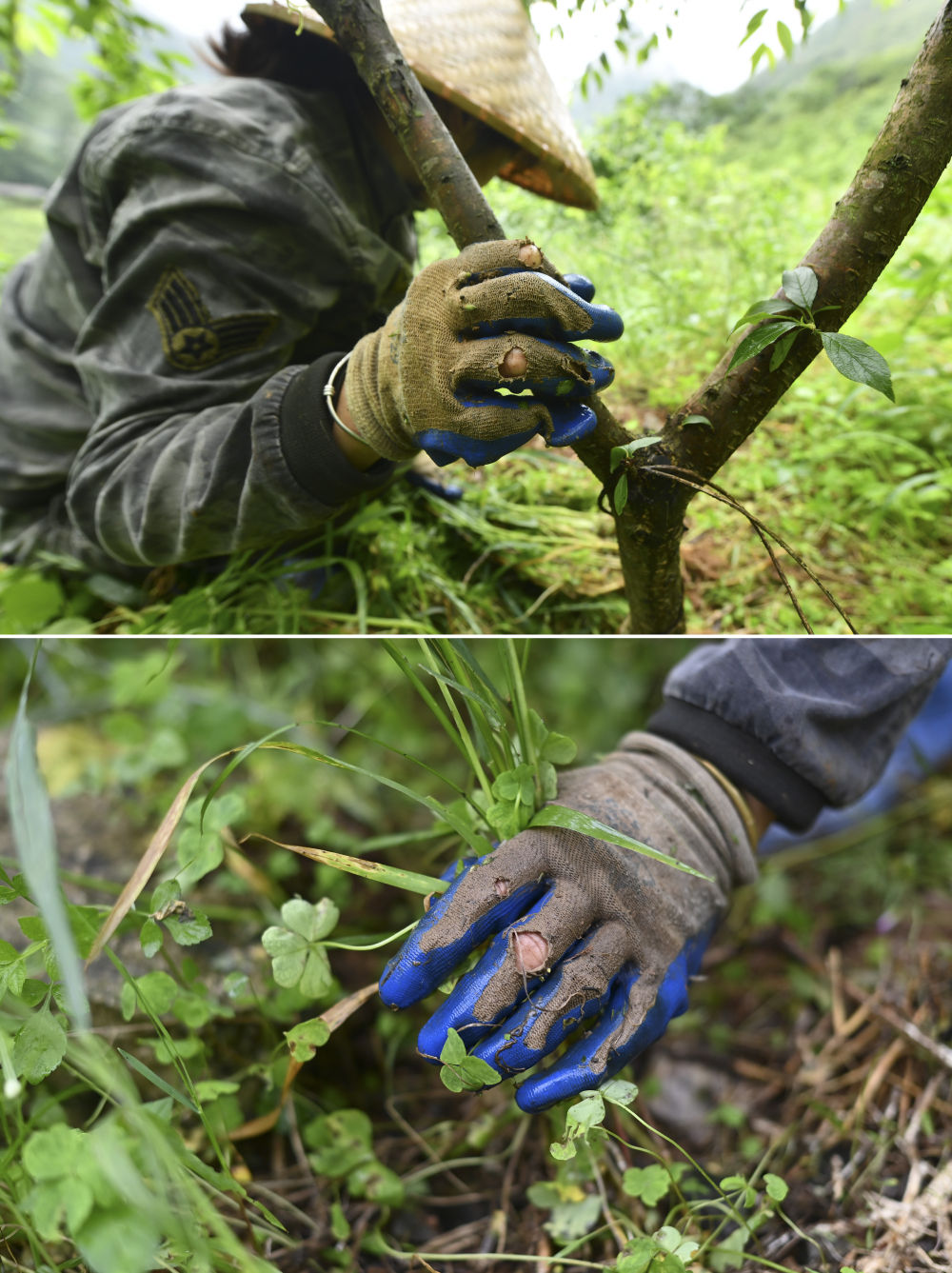 在廣西柳州市融安縣東起鄉(xiāng)銅板屯,61歲的龍飛任在山上為果樹(shù)除草(4月23日攝)。10多年來(lái),龍飛任返鄉(xiāng)創(chuàng)業(yè),和村民們一起發(fā)展水果種植和觀光旅游。