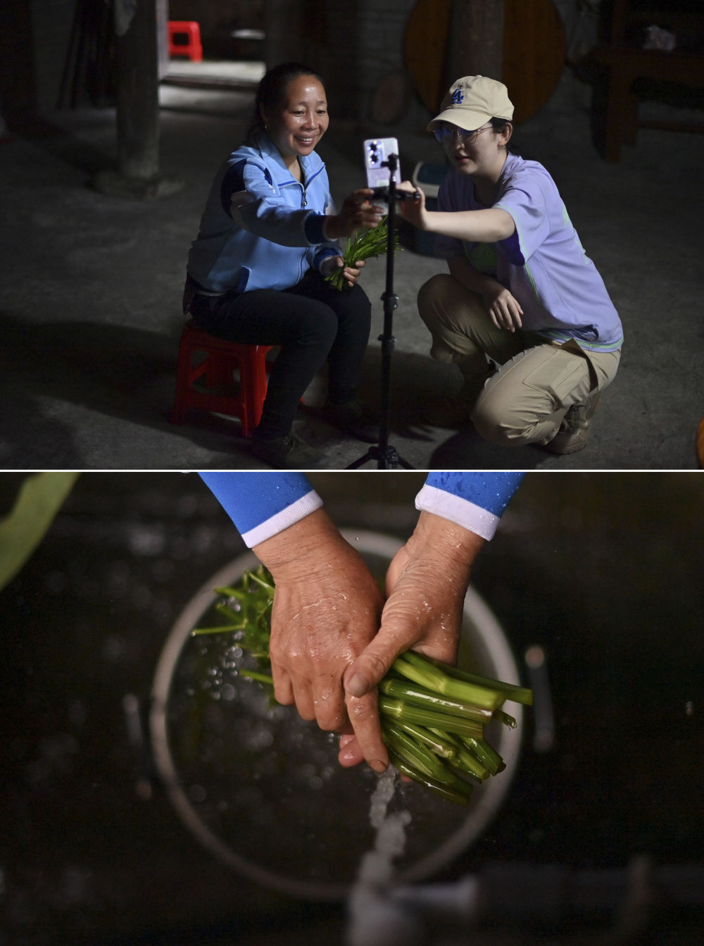 上圖:在廣西柳州市融水苗族自治縣桿洞鄉(xiāng)烏英苗寨,48歲的梁足英(左)向大學(xué)生學(xué)習(xí)直播帶貨;下圖:梁足英在洗野菜,準(zhǔn)備銷往縣城(4月30日攝)。近年來(lái),她積極參加夜校學(xué)習(xí),并通過(guò)網(wǎng)絡(luò)直播銷售當(dāng)?shù)厥卟恕?/p>