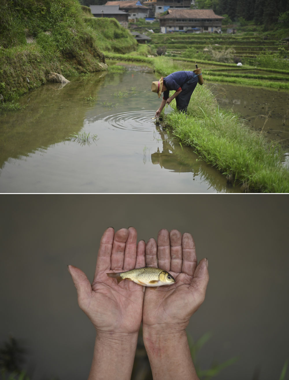 在廣西柳州市融水苗族自治縣桿洞鄉(xiāng)黨鳩村,67歲的吳慶輝在稻田里放魚(yú)苗(4月11日攝)。在稻田里養(yǎng)殖禾花魚(yú)是當(dāng)?shù)氐膫鹘y(tǒng),可以提高稻田利用率,增加收入。