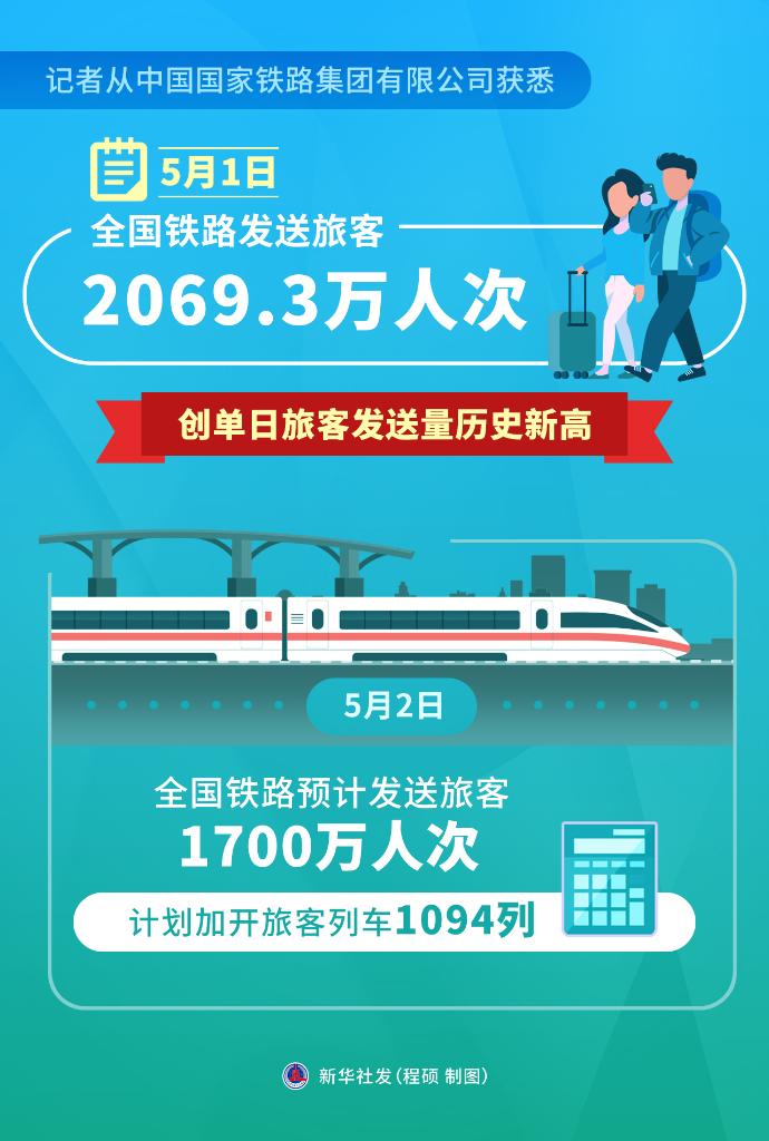 記者從中國國家鐵路集團(tuán)有限公司獲悉,5月1日,全國鐵路發(fā)送旅客2069.3萬人次,創(chuàng)單日旅客發(fā)送量歷史新高。5月2日,全國鐵路預(yù)計(jì)發(fā)送旅客1700萬人次,計(jì)劃加開旅客列車1094列。