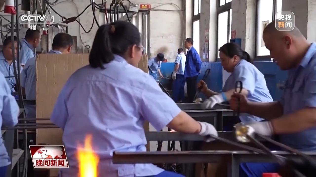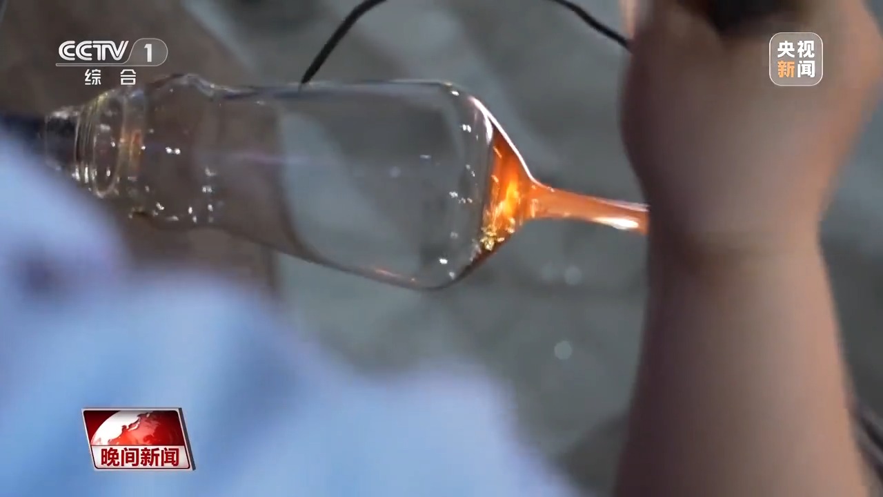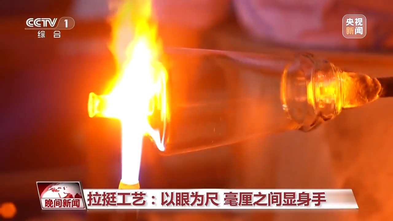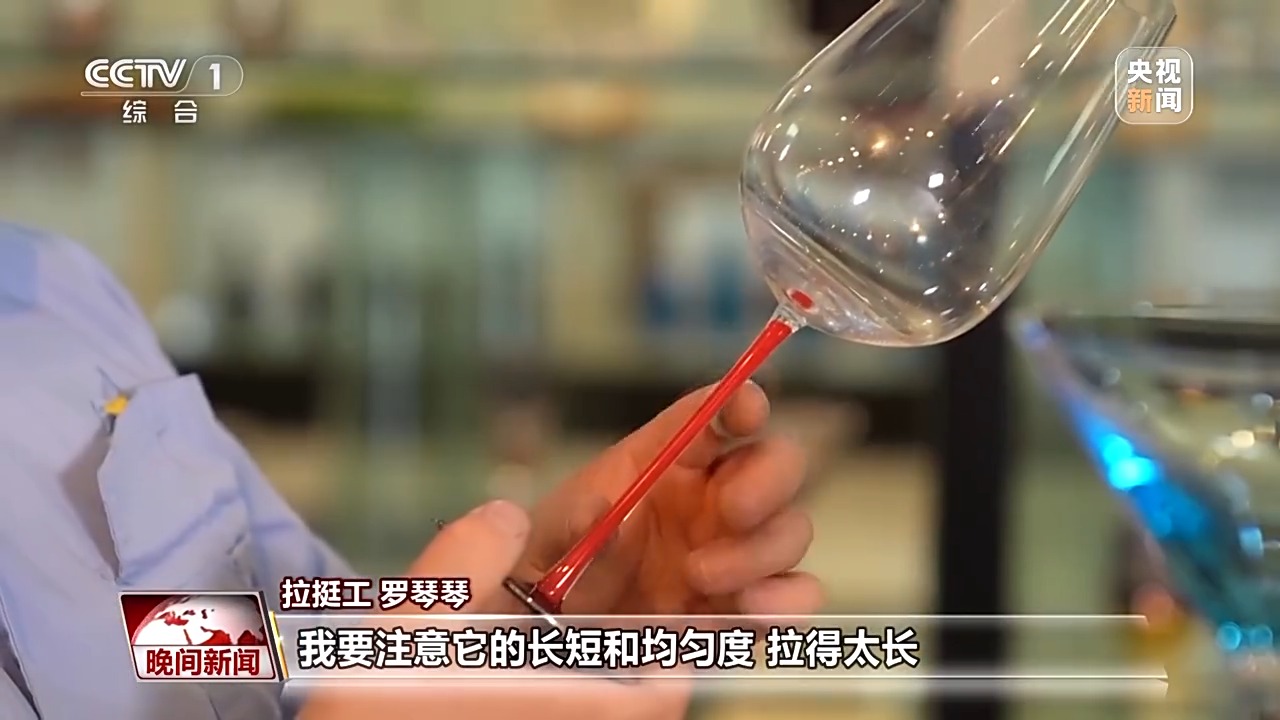 在素有“中國玻璃器皿之都”美譽(yù)的山西祁縣,人工吹制玻璃器皿的手藝被認(rèn)定為省級非遺。一團(tuán)團(tuán)紅彤彤的玻璃溶液,在數(shù)十位師傅手中傳來傳去,吹好杯身的毛坯,傳遞到拉挺師傅羅琴琴手中。