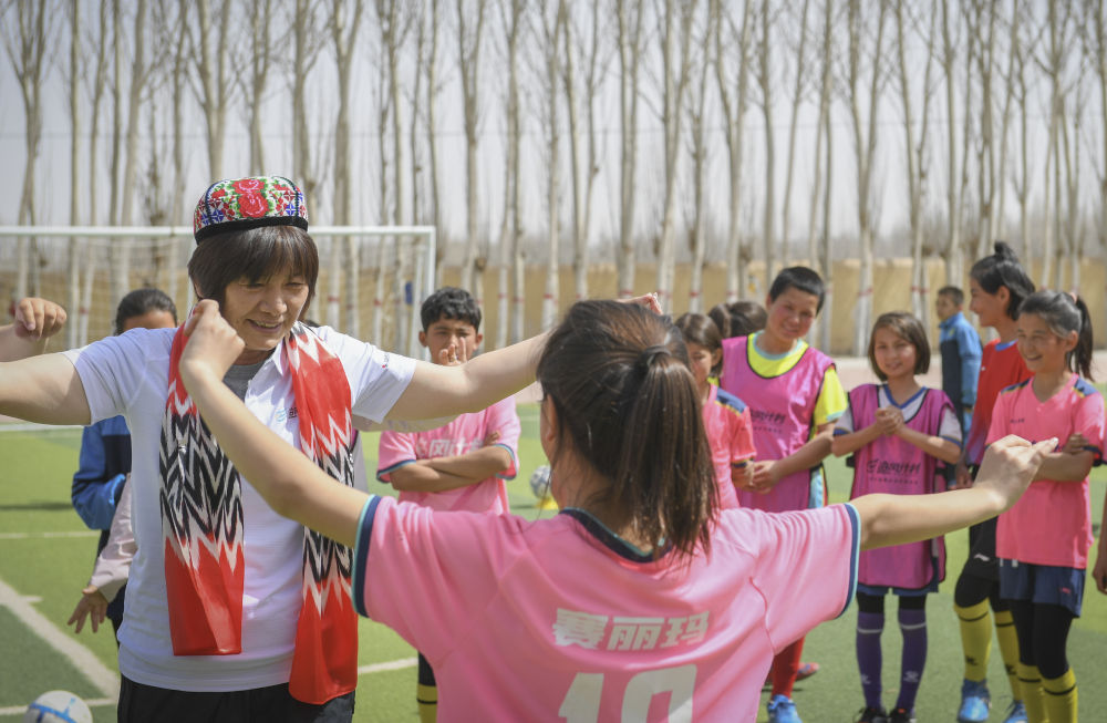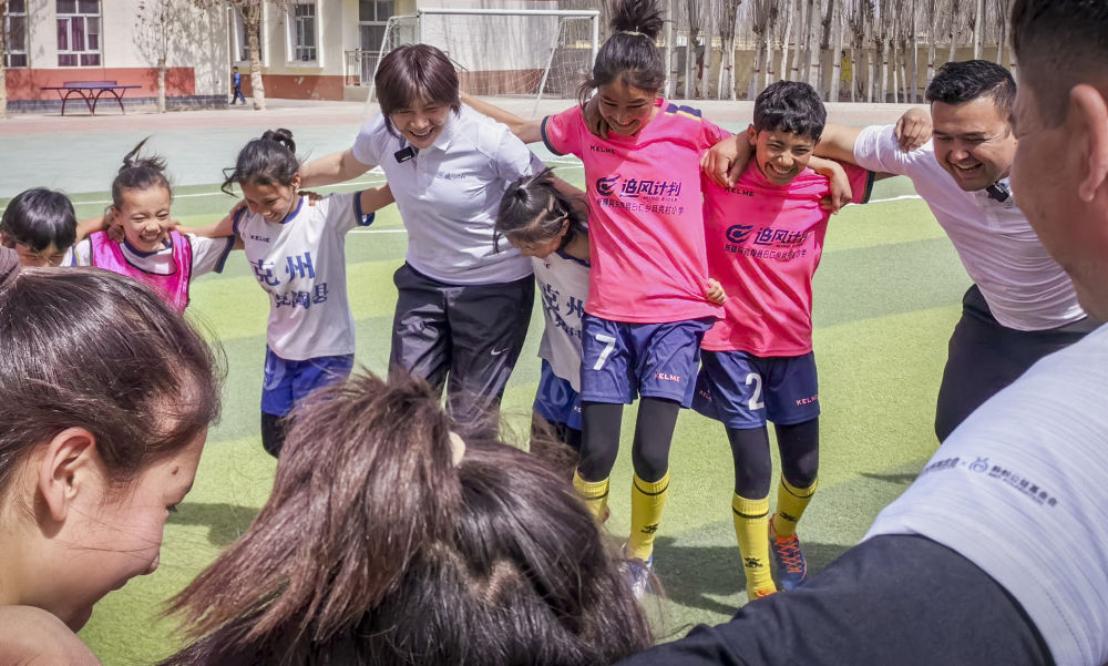 足球賽奪冠,不是第一次了,學(xué)校已經(jīng)連續(xù)多年蟬聯(lián)阿克陶縣校園聯(lián)賽女子組冠軍,連縣城賣馕的大叔都知道,且克村小學(xué)的女足很厲害。但這一次有點(diǎn)不一樣,是因?yàn)閮杉虑橹械牧硪患?,是中國女足前主教練水慶霞要來看她們的比賽,帶她們訓(xùn)練。