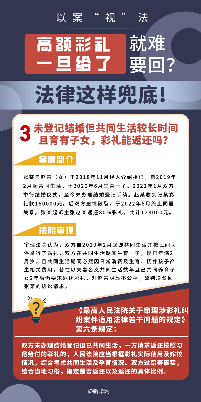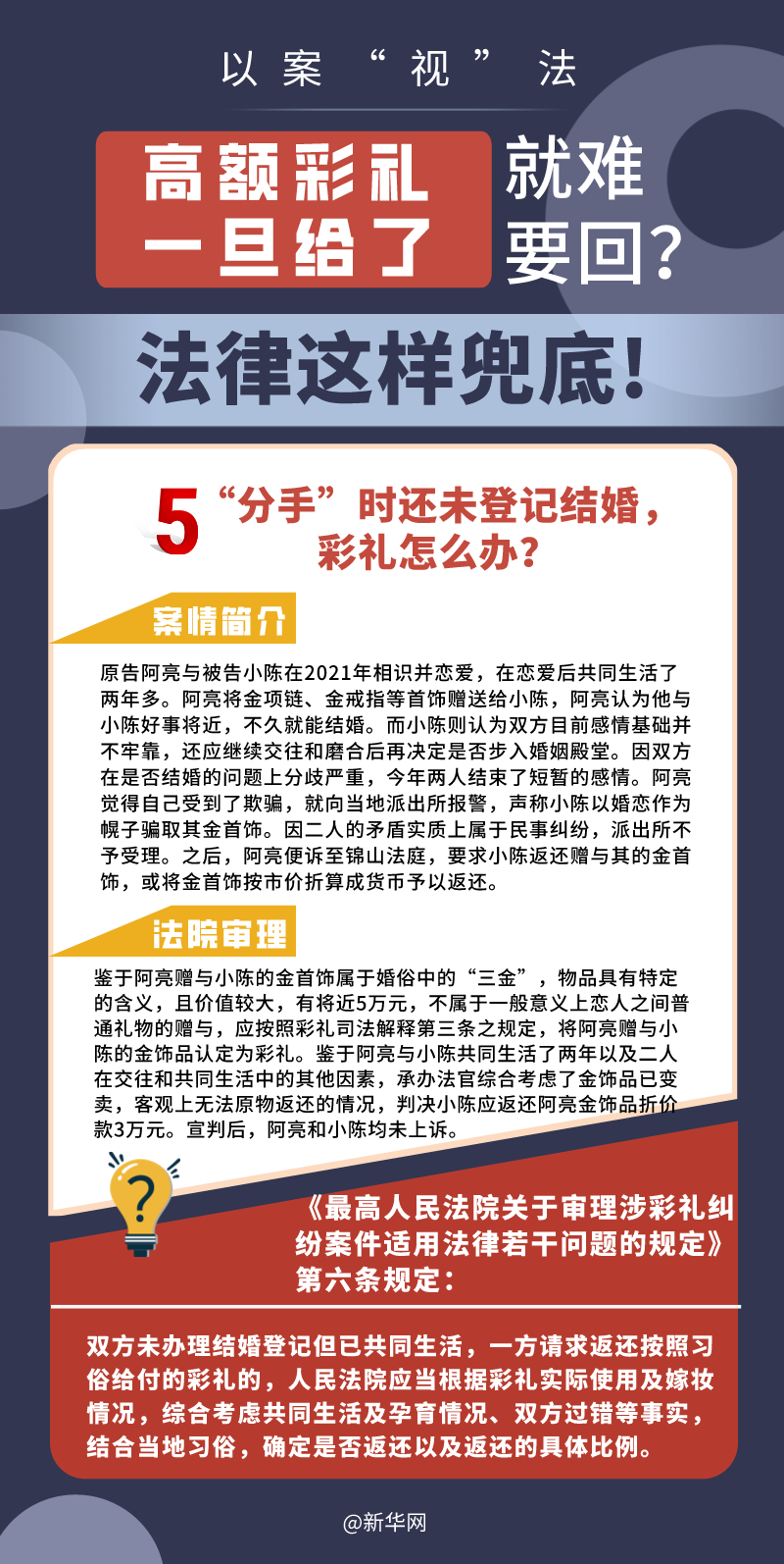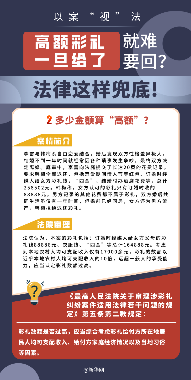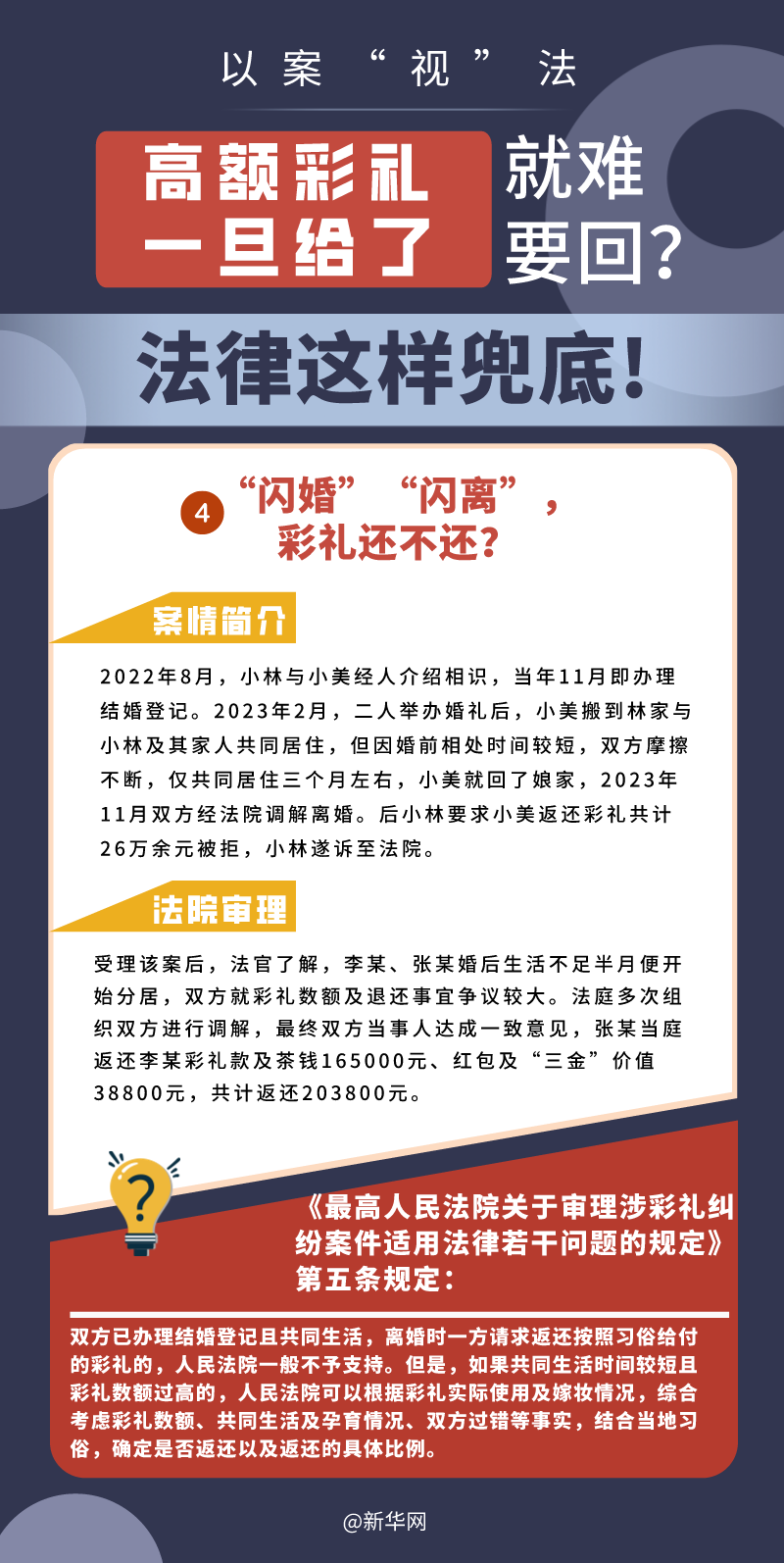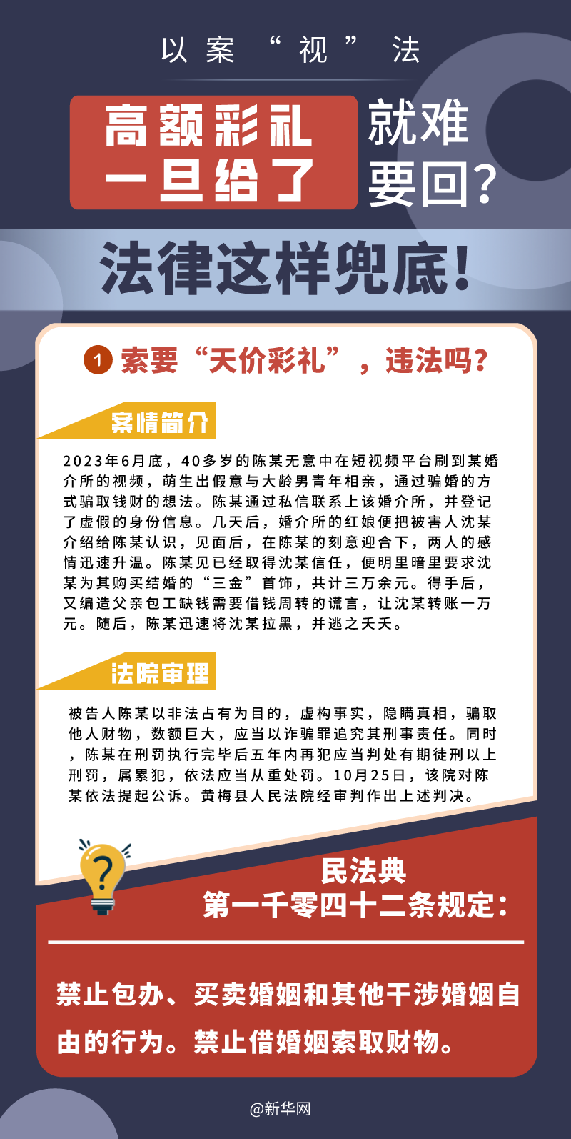 “五一”長(zhǎng)假期間,各地迎來(lái)了婚禮高峰期,“彩禮”話題,尤其農(nóng)村高額彩禮現(xiàn)象備受關(guān)注。破解高價(jià)彩禮,在解決爭(zhēng)議的層面,司法盡了最大努力兜底。本期《以案“視”法》針對(duì)涉“高額彩禮”糾紛,帶大家學(xué)習(xí)相關(guān)法律知識(shí)。