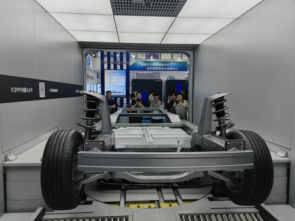 這是在四川省宜賓市舉行的2023世界動力電池大會上展示的新能源汽車換電系統(tǒng)(2023年6月9日攝)。新華社記者 胡旭 攝