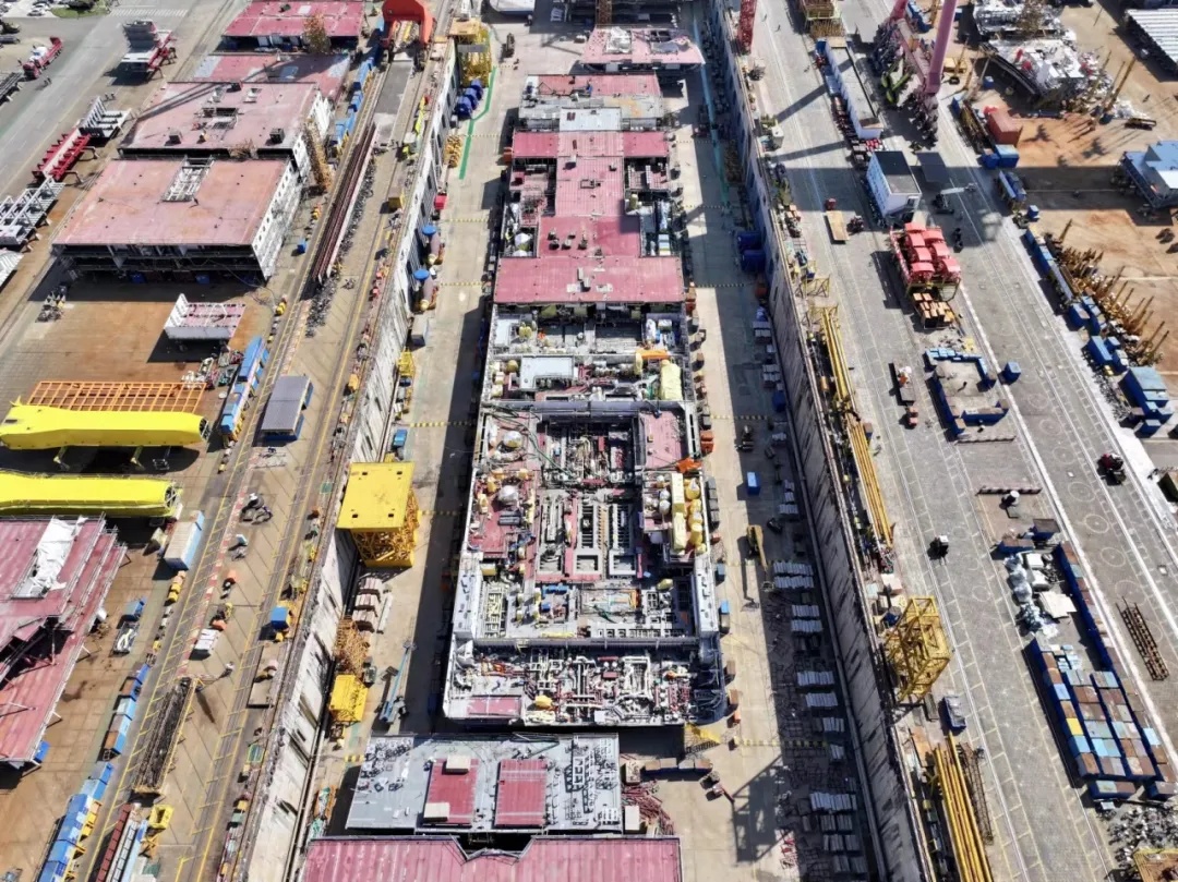 總裝現(xiàn)場(chǎng),三層大部件平臺(tái)已完整成形,正進(jìn)入油漆和涂裝階段。