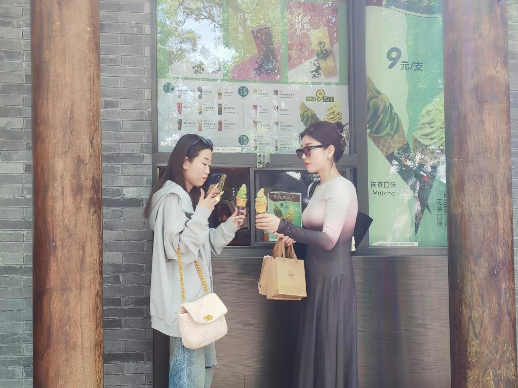 5月8日,位于東四大街的吳裕泰茶莊門口,兩名女士在購買冰激凌。新華社記者謝?,?攝