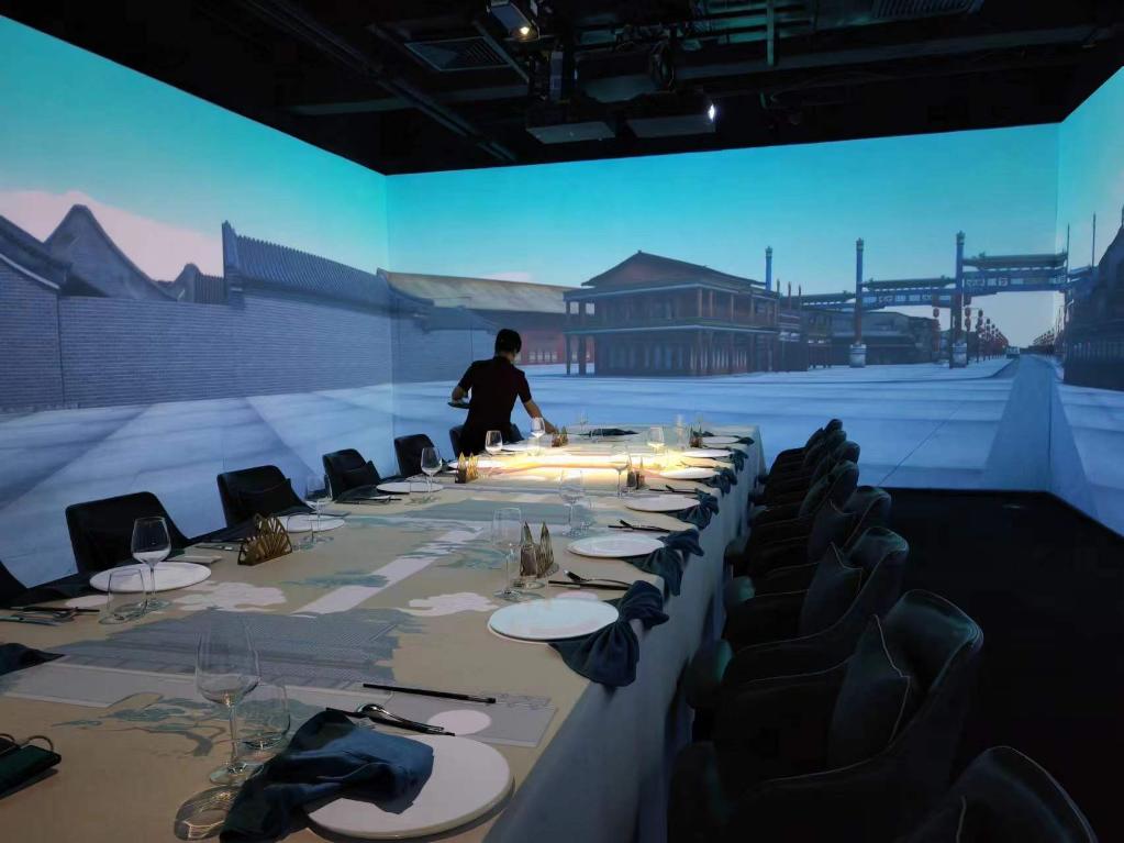 5月9日,前門大街全聚德起源店的光影主題餐廳,店員正在備餐。新華社記者 謝?,?攝