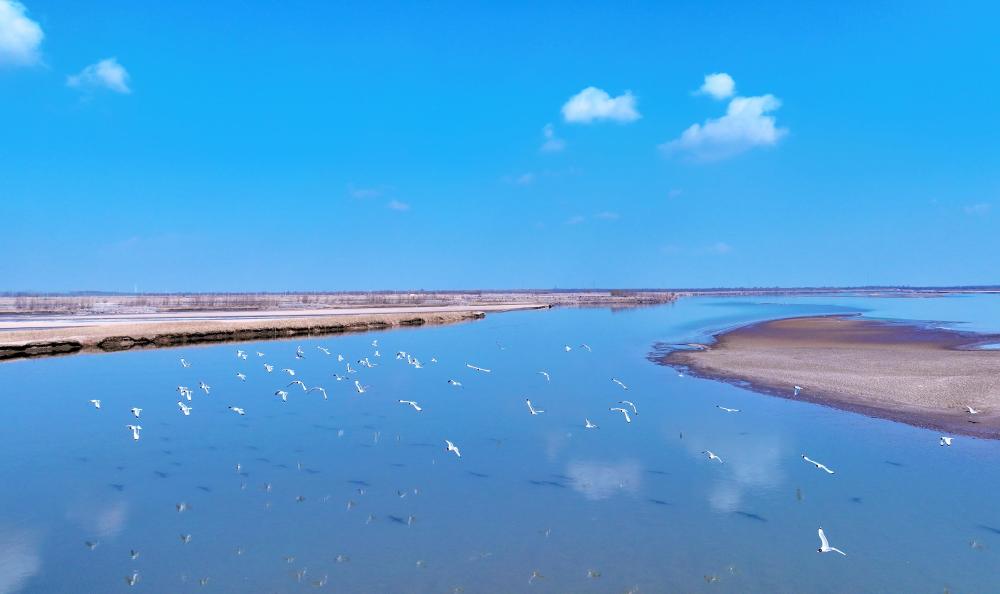在黃河寧夏段,候鳥在灘涂上空飛翔(2024年3月1日攝,無人機照片)。