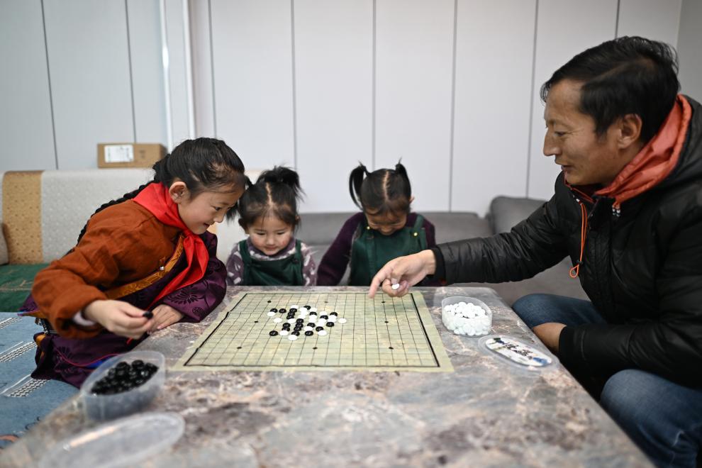青海玉樹曲麻萊縣第二民族完全小學(xué)學(xué)生達(dá)沙旦增德金(左一)在家中和爸爸一起下五子棋(2024年1月12日攝)。新華社記者 張宏祥 攝