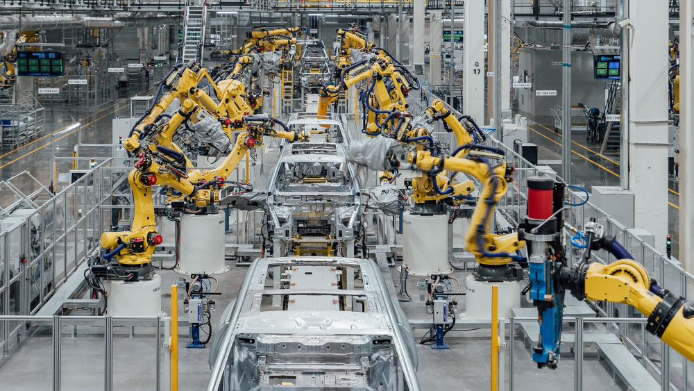 這是在重慶市兩江新區(qū)拍攝的賽力斯汽車超級工廠焊裝車間生產(chǎn)線(2024年2月26日攝,無人機照片)。新華社發(fā)(高彰 攝)