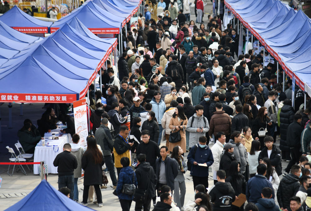 求職者在2024年陜西工會“春送崗位”就業(yè)服務月現(xiàn)場招聘會上了解招聘信息(2024年3月6日攝)。新華社記者 張博文 攝