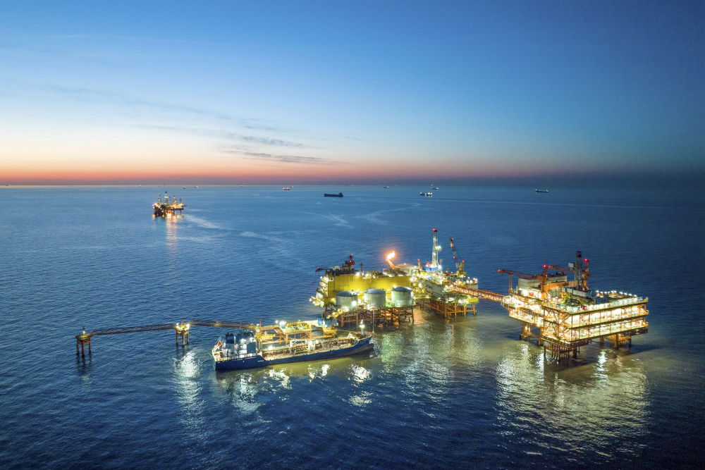 這是2024年1月25日拍攝的埕北油田全景(無人機照片)。當日,位于渤海灣西南部的埕北油田油氣處理與岸電設備共建平臺——CEPC(中心平臺)正式投產(chǎn),該平臺可使油田接入來自陸地的綠色電力,減少海上“自發(fā)電”帶來的天然氣和原油消耗。新華社發(fā)(杜鵬輝攝)