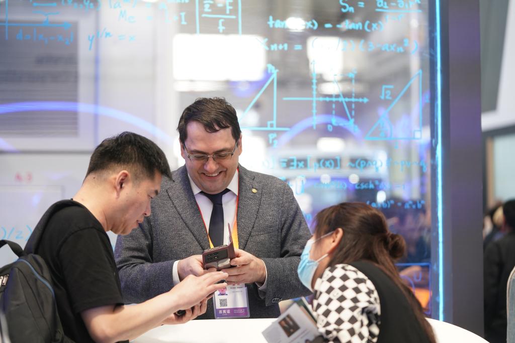 5月18日,在第八屆中俄博覽會展館內(nèi),參會者在進行商務(wù)交流。新華社記者 王松 攝