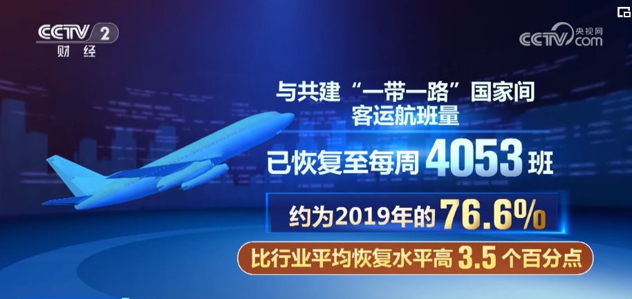 與共建“一帶一路”國(guó)家間客運(yùn)航班量已恢復(fù)至每周4053班,約為2019年的76.6%,比行業(yè)平均恢復(fù)水平高3.5個(gè)百分點(diǎn)。