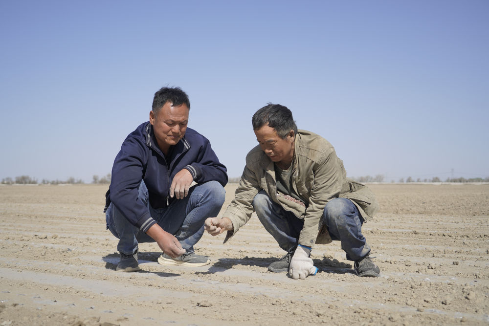 2024年4月23日,雙泉農(nóng)業(yè)專業(yè)合作社負(fù)責(zé)人何洪濤(左)在棉田里工作。