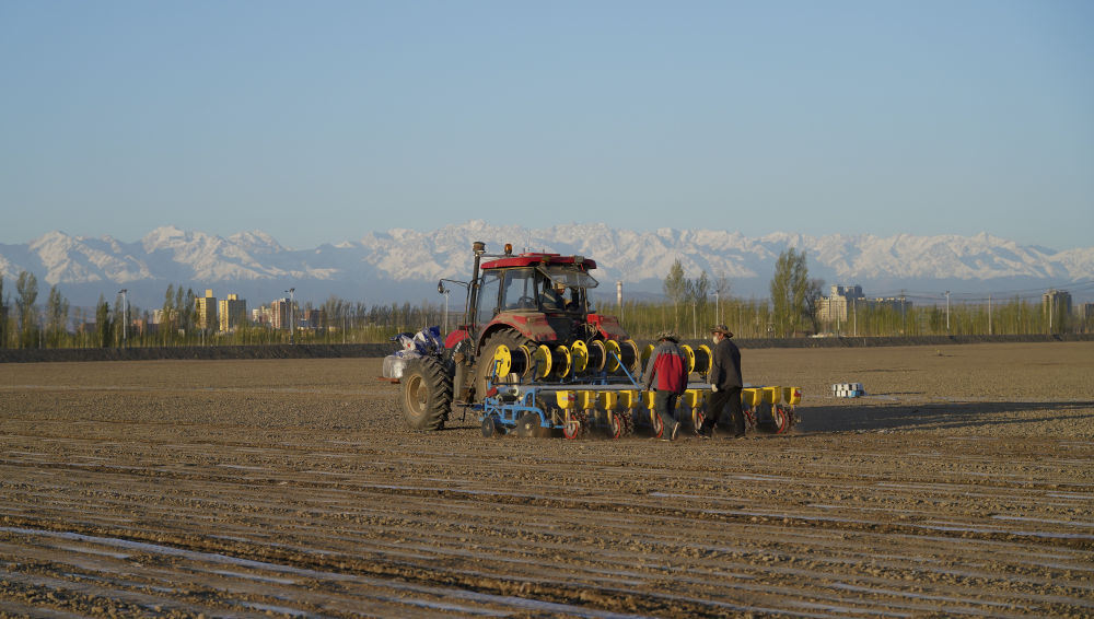 從哈衣繞拉管理的棉田向南望去,可見綿延起伏的天山山脈,終年不化的積雪、線條硬朗的山脊、若隱若現(xiàn)的云杉,像一幅氣勢磅礴的風(fēng)景畫。一臺高大的機器正按照北斗導(dǎo)航設(shè)計的路線筆直地行進(jìn),車尾安裝的自動化播種設(shè)備將透明的薄膜、黑色的滴灌帶、紅色的包衣棉籽,一并整齊地埋進(jìn)褐色的泥土里。