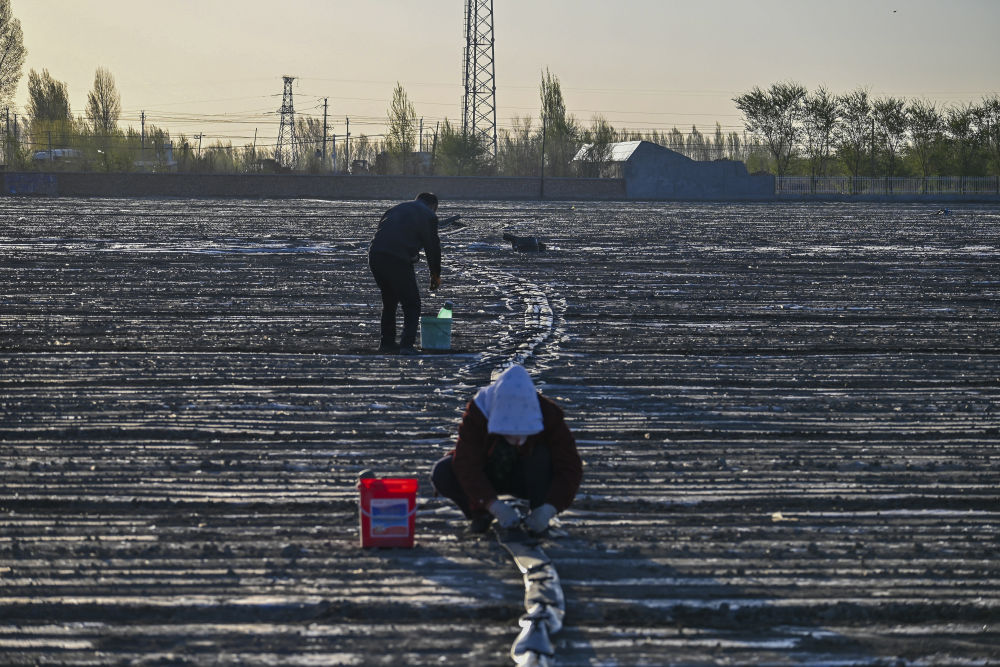 2024年4月19日,在新疆沙灣市,農(nóng)民在棉田里安裝連接泵房和滴灌帶的供水系統(tǒng)。