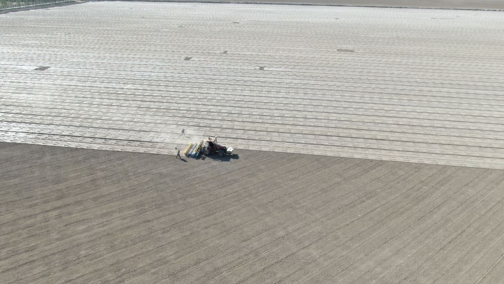 2024年4月23日,在新疆沙灣市,播種機在棉田里播種棉花(無人機照片)。