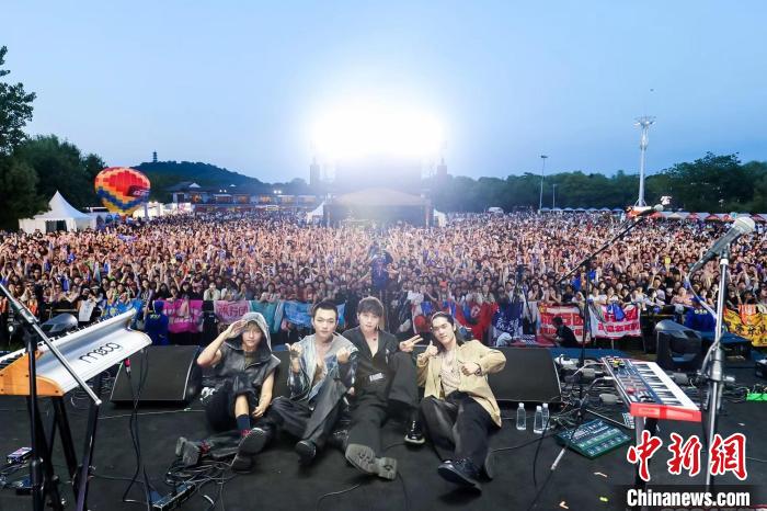 西施音樂節(jié)現(xiàn)場(chǎng),臺(tái)灣“傻子與白癡”樂隊(duì)與觀眾留影。 諸暨臺(tái)辦供圖