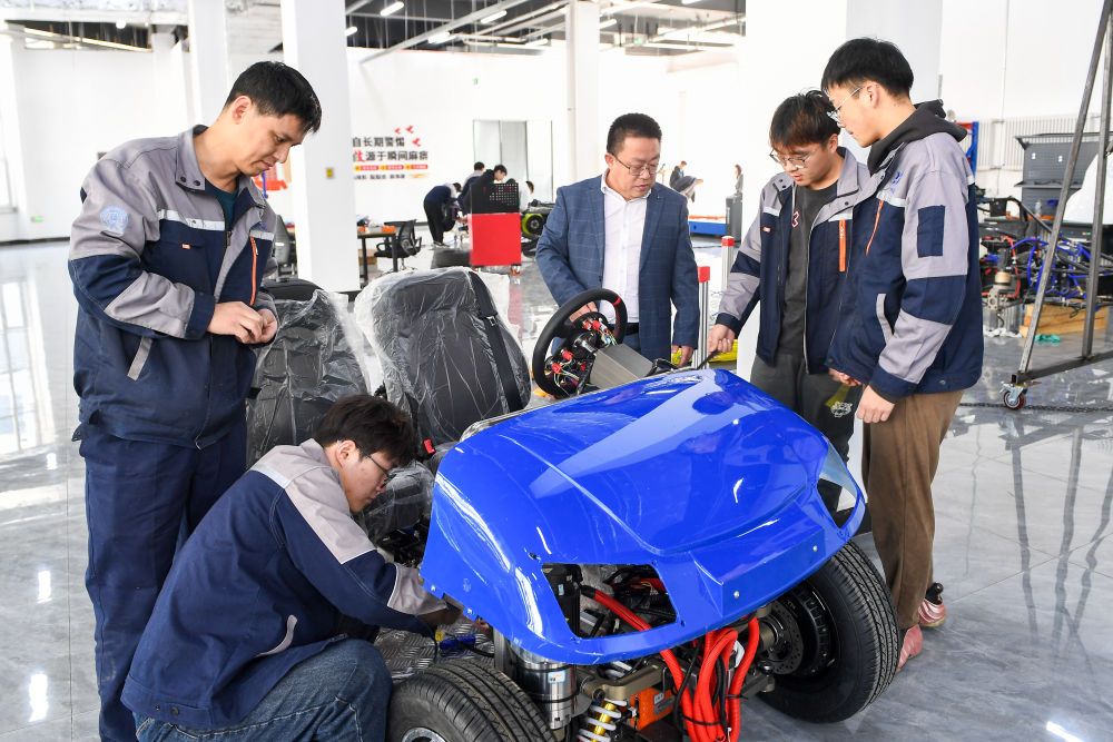 2024年3月13日,長(zhǎng)春市麥迪克智行汽車(chē)科技有限公司,吉林大學(xué)汽車(chē)工程學(xué)院教授靳立強(qiáng)(右三)與同事檢查智能底盤(pán)樣車(chē)。新華社記者 張楠 攝