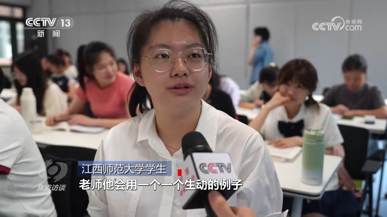 江西師范大學(xué)學(xué)生:“老師他會(huì)用一個(gè)生動(dòng)的例子來表達(dá)他的觀點(diǎn),然后也會(huì)用一些讓人感覺很熱血沸騰的,也有那種催人眼淚的故事,然后來激蕩我的心靈。”