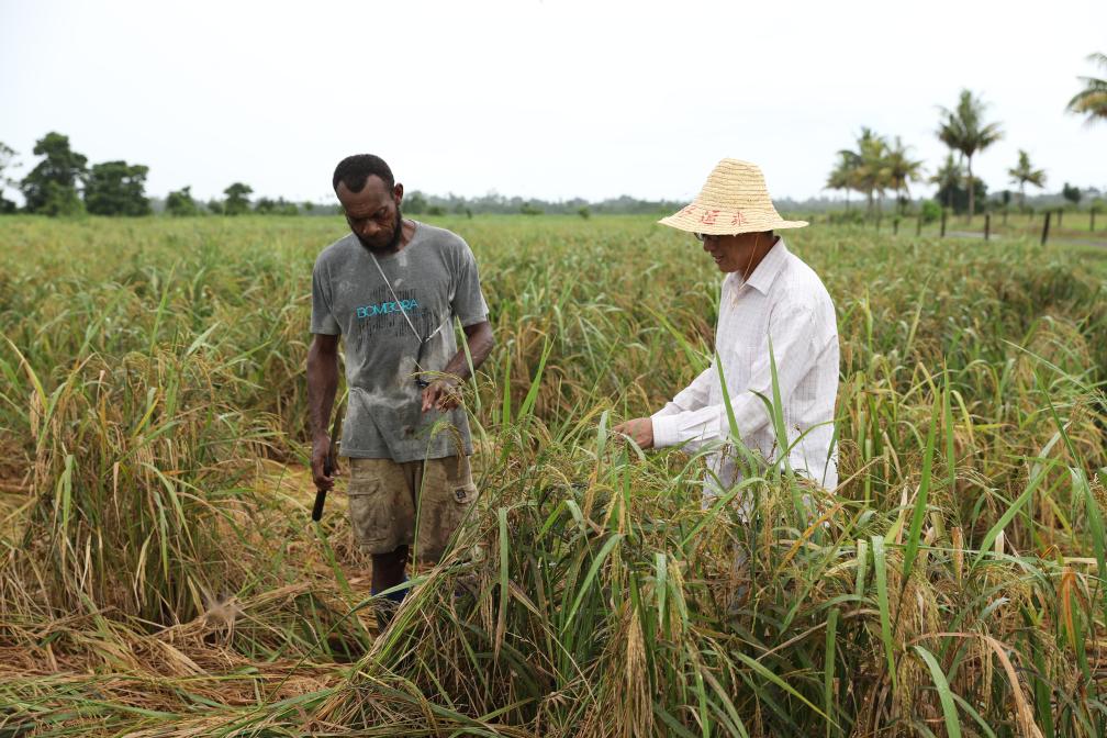 3月13日,在太平洋島國(guó)斐濟(jì)瑙索里鎮(zhèn),中國(guó)專(zhuān)家(右)在中國(guó)援斐濟(jì)農(nóng)業(yè)發(fā)展技術(shù)水稻項(xiàng)目試驗(yàn)示范培訓(xùn)基地查看暴雨過(guò)后水稻倒伏情況。新華社發(fā)(桑欽龍攝)