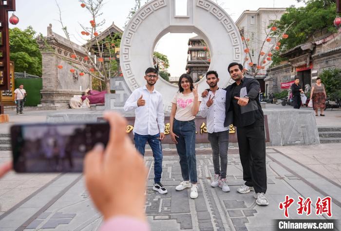 圖為邯森等4名巴基斯坦留學(xué)生在回車巷歷史文化街區(qū)拍照留念。王倩倩攝