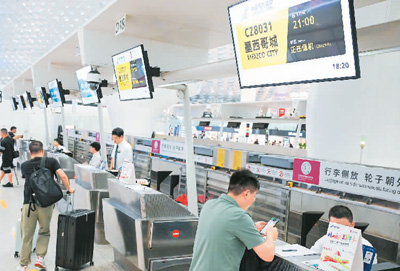 在廣東深圳寶安國(guó)際機(jī)場(chǎng),搭乘深圳—墨西哥城直飛航線的乘客辦理值機(jī)。