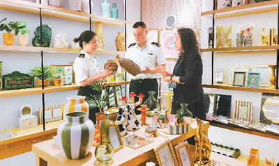 近日,廣州海關所屬海珠海關關員到廣東盈浩工藝制品有限公司調研海外倉業(yè)務發(fā)展情況。