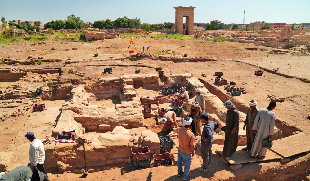 在中埃盧克索孟圖神廟聯(lián)合考古項目所在地,工作人員挖掘清理神廟遺址附近的第四小神殿(2024年5月7日攝)。中埃聯(lián)合考古項目組供圖