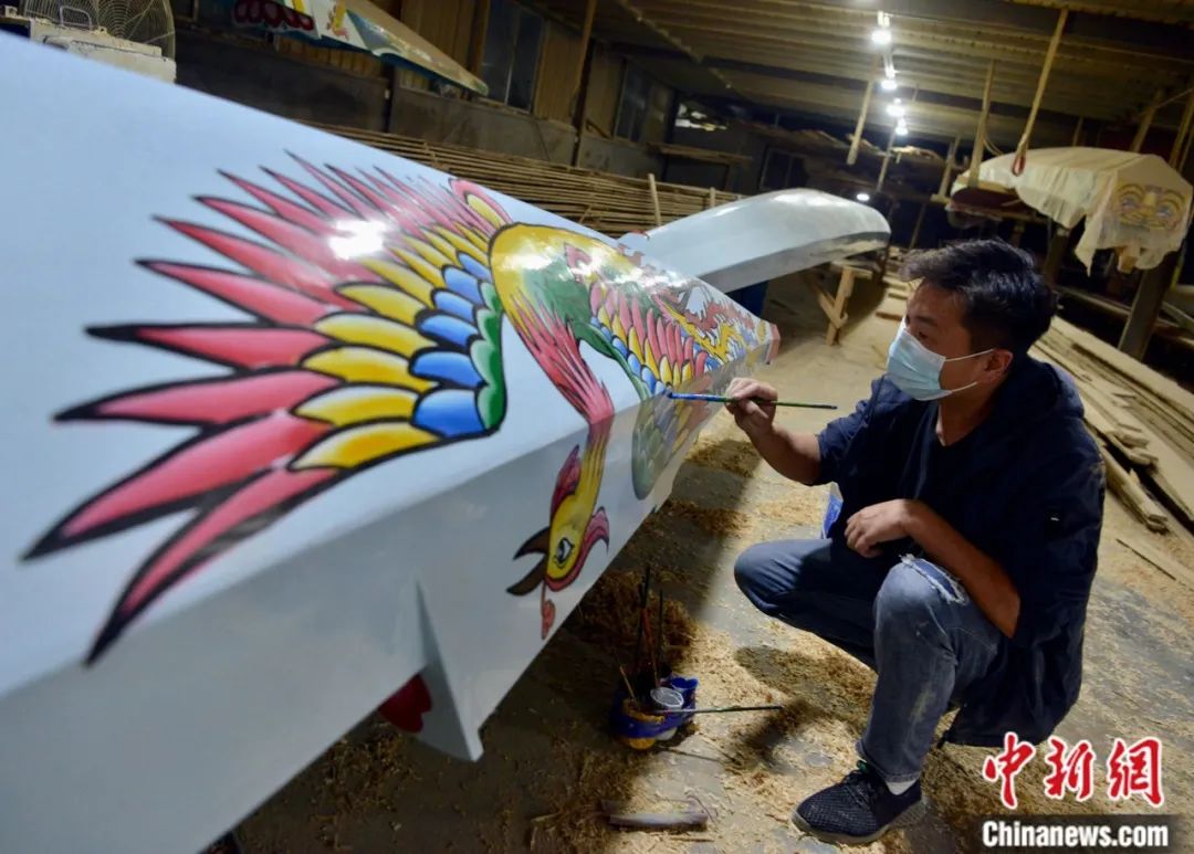 “龍舟世家”方忠雄龍舟廠畫花師傅在對龍舟“化妝”。一條龍舟基本是船頭和船身畫蓮花、壽桃、鯉魚等,寓意吉祥如意。在船尾,則是畫龍、鳳、鷹等靈禽猛獸,寓意霸氣威武。中新社記者 張斌 攝