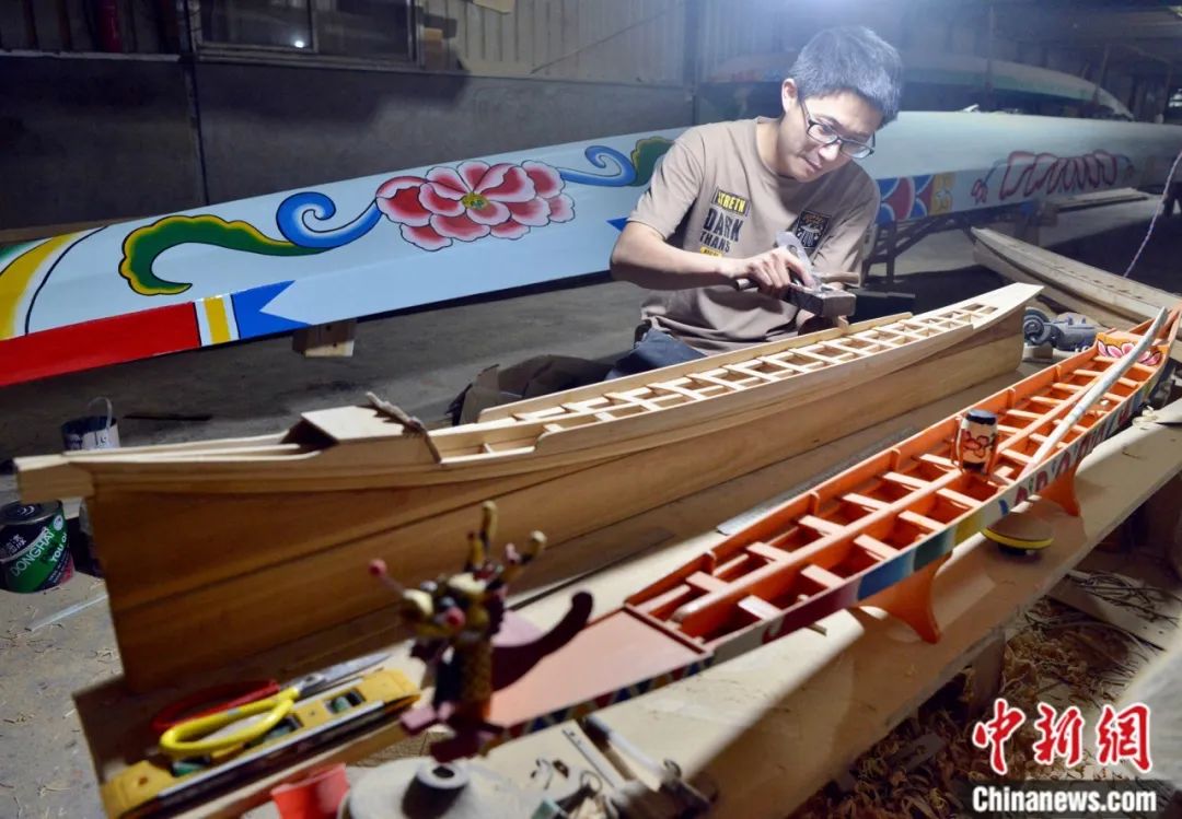 夜里,方莊龍舟制造技藝第四代傳人方劍偉正在制作“龍龍仔”。作為新一代龍舟技藝傳承人,近幾年他嘗試將龍舟做成模型進行推廣。造型多樣的“龍龍仔”應(yīng)運而生,收獲不少龍舟愛好者的喜愛。中新社記者 張斌 攝