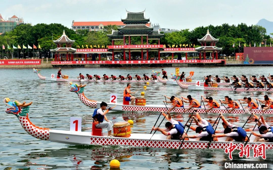 海峽兩岸龍舟賽上,選手們乘風逐浪、奮勇爭先。中新社記者 呂明 攝