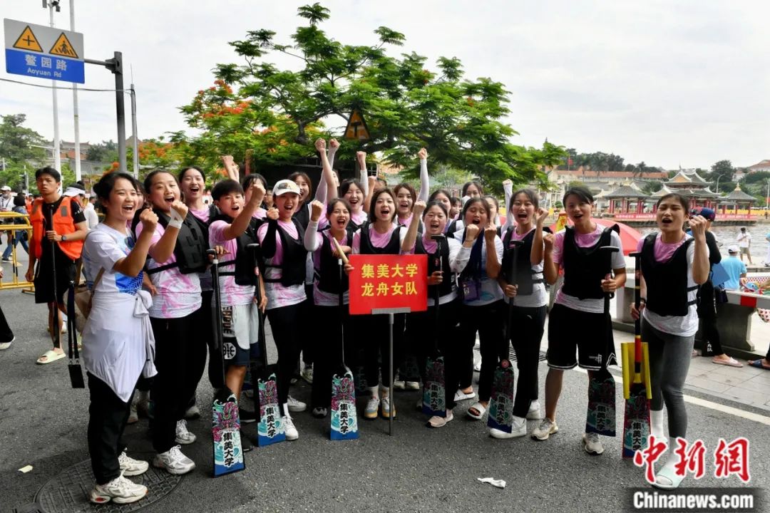 海峽兩岸龍舟賽在廈門集美上演。圖為集美大學龍舟女隊參加比賽。中新社記者 呂明 攝