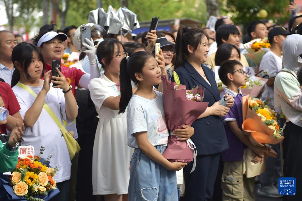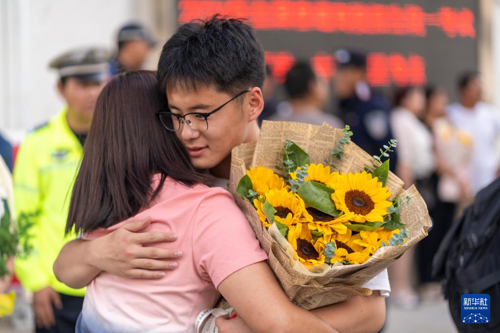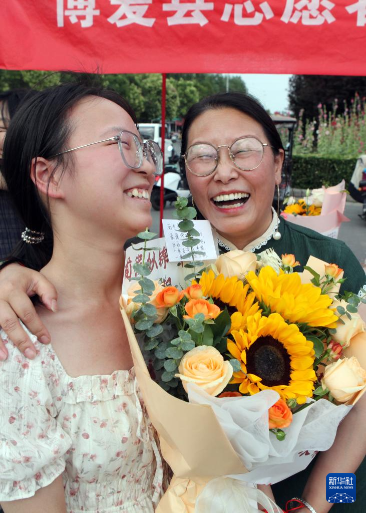 6月8日,在河南省焦作市博愛縣第一中學(xué)考點(diǎn),家長為走出考場的孩子送上鮮花。新華社發(fā)(程全攝)