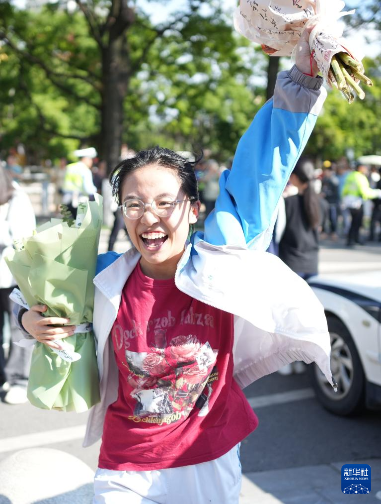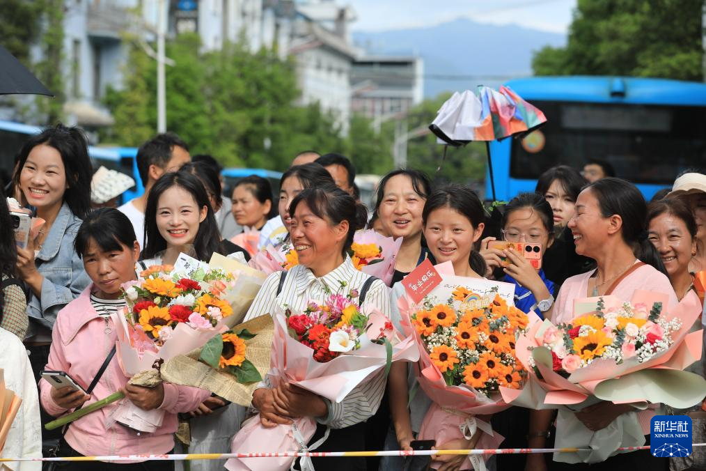 6月8日,在云南省昆明市第五中學(xué)考點(diǎn),考生手持鮮花慶??荚嚱Y(jié)束。新華社發(fā)(張正舉攝)