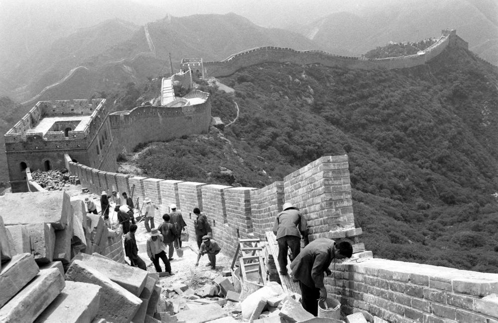 工人正在修復(fù)北京八達(dá)嶺長(zhǎng)城的一段城墻。這是用由北京晚報(bào)、八達(dá)嶺特區(qū)辦事處等單位聯(lián)合發(fā)起“愛我中華 修我長(zhǎng)城”社會(huì)贊助活動(dòng)所獲款項(xiàng)進(jìn)行修復(fù)的第一期工程 (資料照片,1984年8月11日發(fā))。新華社記者 袁汝遜 攝