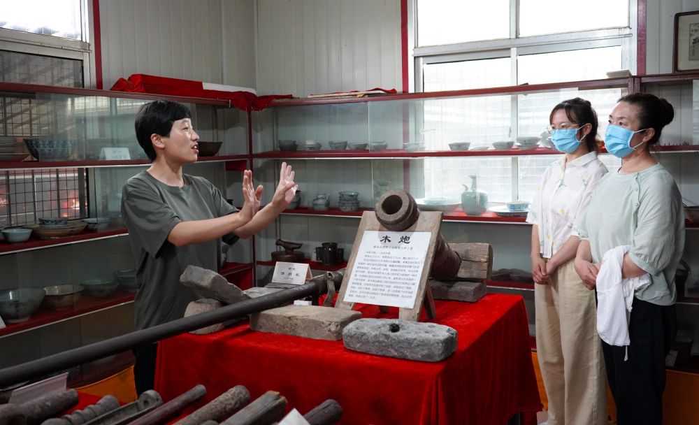 在秦皇島市海港區(qū)的長(zhǎng)城文化展館,長(zhǎng)城保護(hù)員李翠(左一)向游客介紹長(zhǎng)城文化知識(shí)(2021年7月8日攝)。新華社記者 金皓原 攝