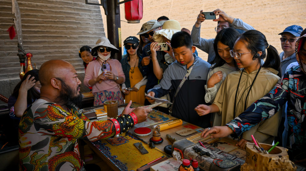 在甘肅嘉峪關(guān)關(guān)城景區(qū),網(wǎng)紅“關(guān)長(zhǎng)”李森(左)為游客奉上自己手寫好的文創(chuàng)產(chǎn)品“關(guān)照”(2023年7月14日攝)。新華社記者 劉金海 攝