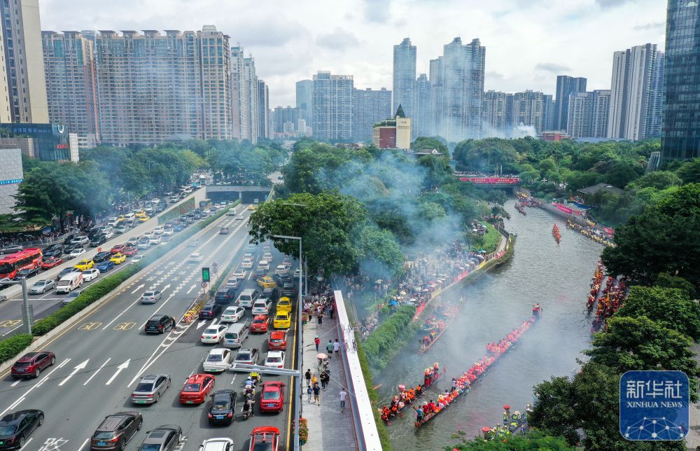 6月10日,獵德村熱鬧的傳統(tǒng)龍舟“龍船景”與繁忙的現(xiàn)代都市交匯相融(無人機照片)?!褒埓啊笔菑V府地區(qū)水鄉(xiāng)在端午期間舉辦的一種民俗活動。新華社記者 劉大偉 攝