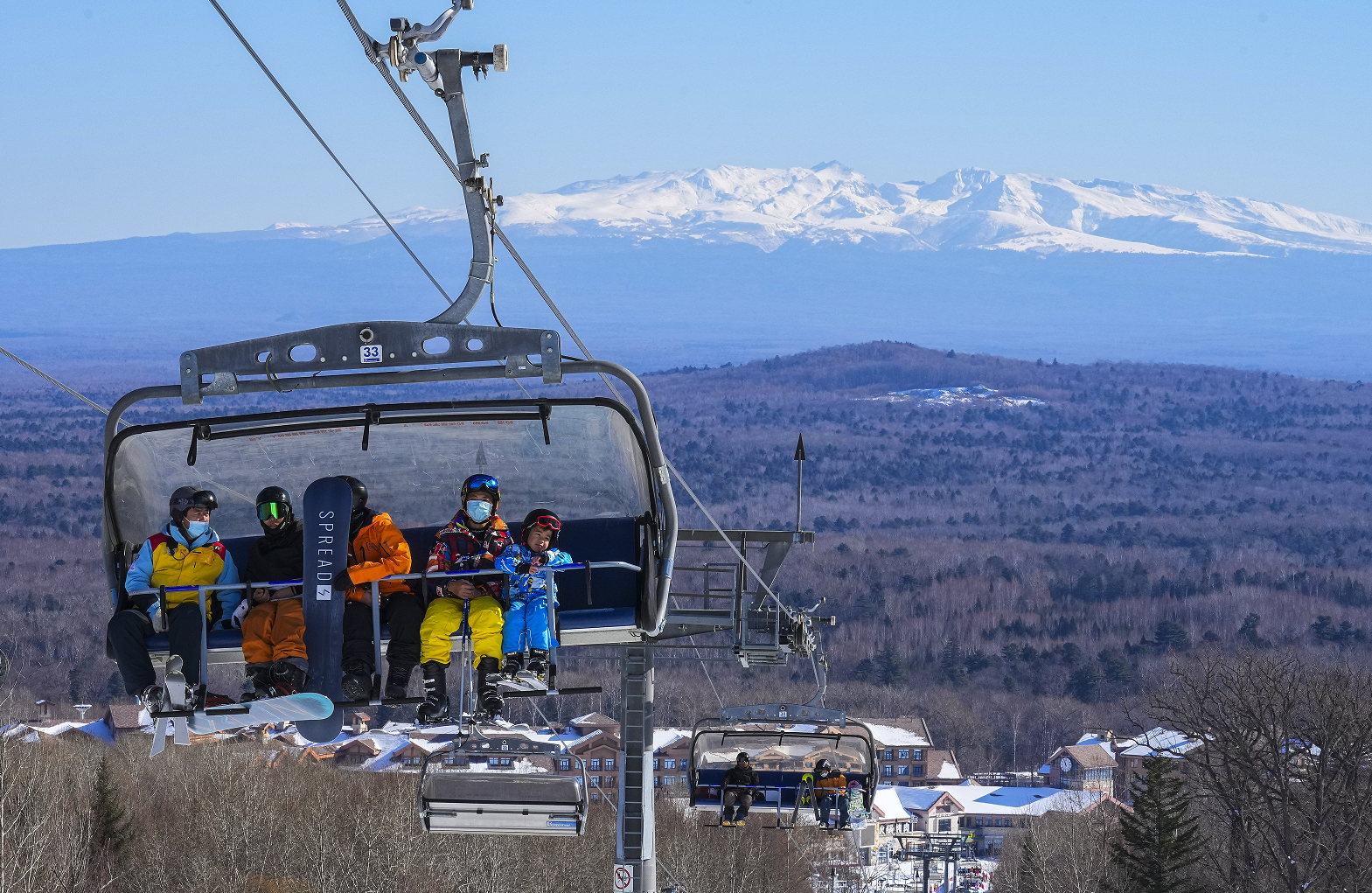 長(zhǎng)白山西坡的萬(wàn)達(dá)滑雪度假區(qū)內(nèi),雪友乘坐纜車(chē)上山。 記者 許暢 攝