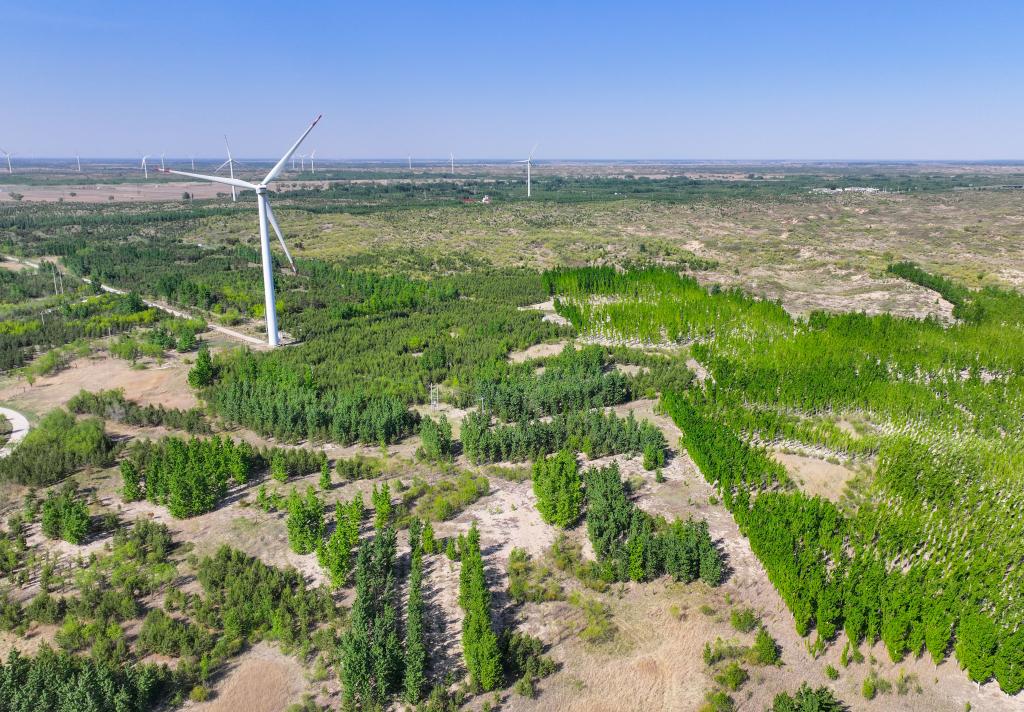 這是在內(nèi)蒙古通遼市科爾沁沙地“雙百萬畝”綜合治理工程努古斯臺(tái)項(xiàng)目區(qū)拍攝的風(fēng)力發(fā)電機(jī)組(2024年5月15日攝,無人機(jī)照片)。新華社記者 連振 攝
