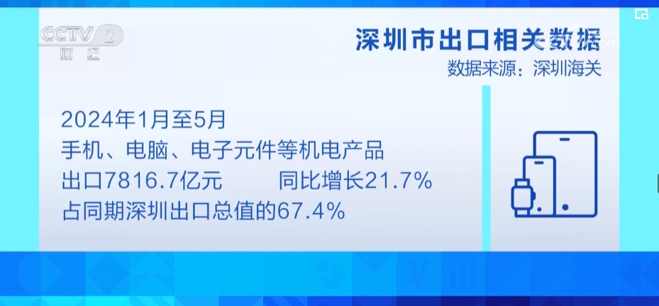 2024年前5個(gè)月,深圳市出口總額達(dá)1.16萬億元,同比增長(zhǎng)37.2%。其中,手機(jī)、電腦、電子元件等機(jī)電產(chǎn)品出口7816.7億元,同比增長(zhǎng)21.7%,占同期深圳出口總值的67.4%。