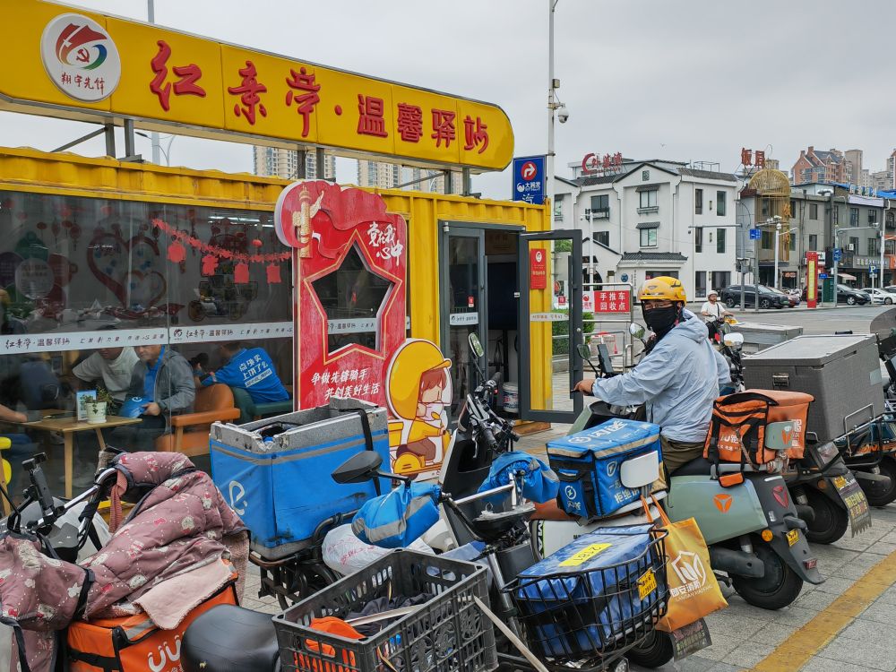 空調(diào)、微波爐、藥箱……記者在江蘇淮安經(jīng)濟(jì)技術(shù)開發(fā)區(qū)大潤發(fā)超市旁的溫馨驛站發(fā)現(xiàn),這里空間不大,但功能齊全。不時有騎手進(jìn)出,在此短暫休息、補(bǔ)水、給手機(jī)充電、閑聊。