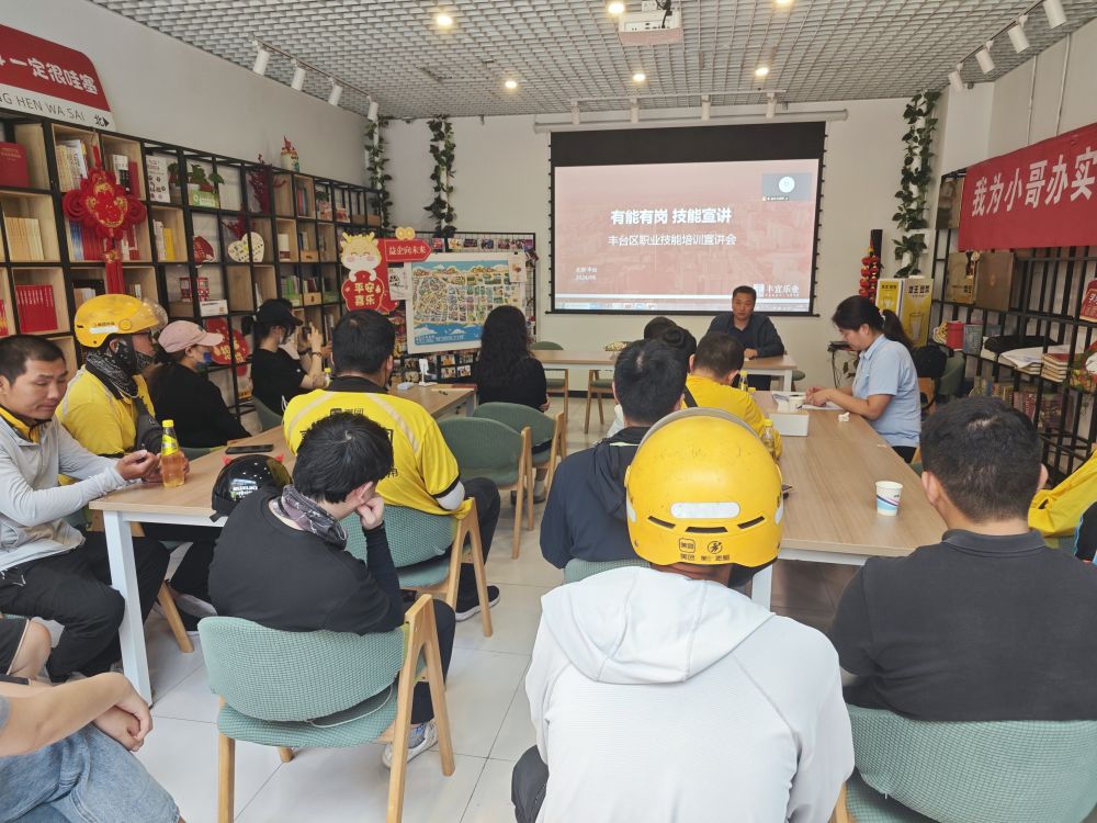面向外賣員的職業(yè)技能培訓(xùn)會在北京中關(guān)村豐臺園內(nèi)的務(wù)工人員之家開講。新華社記者陳旭 攝