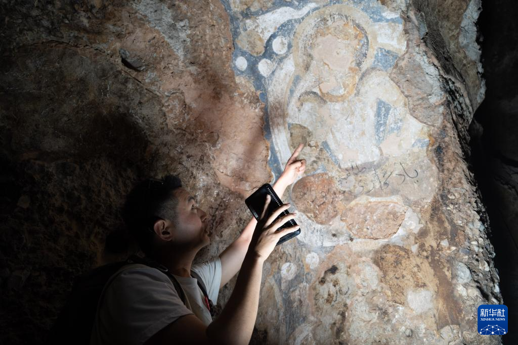 6月15日,在阿富汗巴米揚(yáng)省,中國(guó)學(xué)者邵學(xué)成在一處石窟中觀察壁畫(huà)。新華社記者 趙家淞 攝