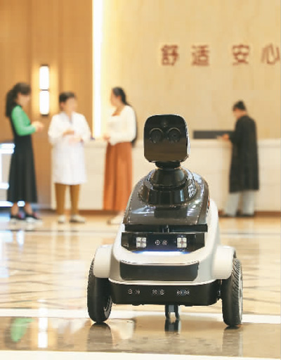 圖為在山東省東營市東營區(qū)德康寧醫(yī)養(yǎng)中心,智能機(jī)器人在巡檢。