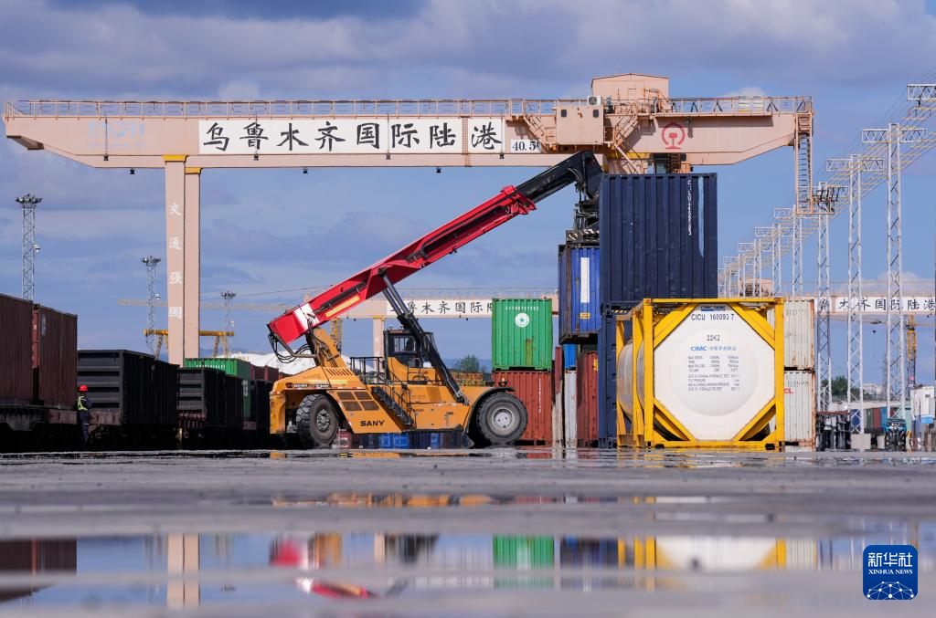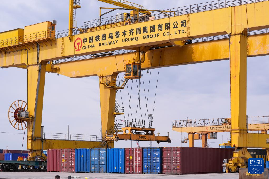 在新疆烏魯木齊國(guó)際陸港區(qū),集裝箱裝卸作業(yè)有序進(jìn)行(2024年5月27日攝)。新華社記者 王菲 攝