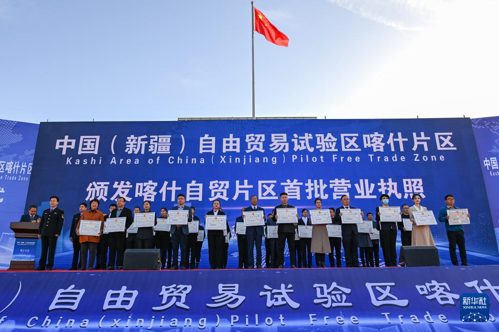 2023年11月11日,在中國(guó)(新疆)自由貿(mào)易試驗(yàn)區(qū)喀什片區(qū)揭牌儀式現(xiàn)場(chǎng),首批入駐自貿(mào)片區(qū)的經(jīng)營(yíng)主體獲頒營(yíng)業(yè)執(zhí)照。新華社記者 丁磊 攝